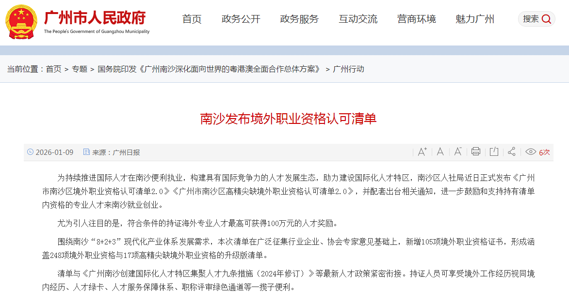 为进一步推进国际人才在南沙执业便利化,构建具有国际竞争力的引才、聚才、用才机制,加快建设国际化人才特区,助力打造世界一流营商环境,南沙区人社局制定了《广州市南沙区境外职业资格认可清单2.0》《广州市南沙区高精尖缺境外职业资格认可清单2.0》,支持和鼓励持有清单内资格证书的专业人员来南沙创业就业。现将清单印发你们,并就有关事项通知如下: